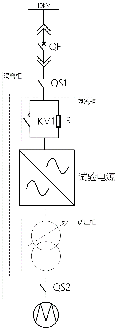 1)将高压变频试验电源串联在用户现场的10KV与高压电机之间即可。试验电源的所有部件采用内部连线,用户只须连接380V/6KV/10KV输入、高压输出、AC220V控制电源和控制信号线即可,方便快捷,操作简单;