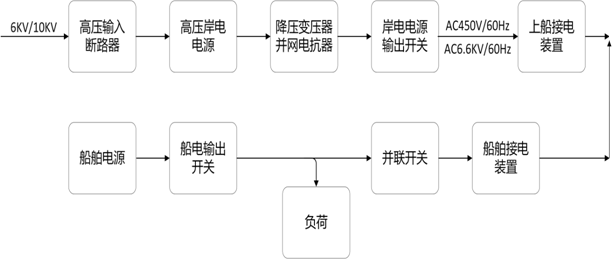 系统通过岸边接电箱及柔性电缆将电源送至船舶接电装置。最后通过船上的并网装置实现与船舶辅机的并网,接入船用电系统供全船设备使用。当并网成功后,船舶辅机与岸电电源将自动实现负载转移,最终船舶辅机停运、船用电气设备完全由岸电电源供电。