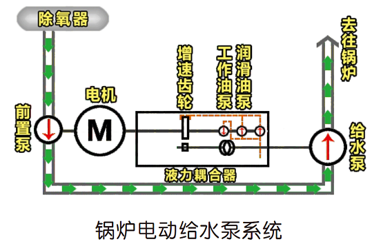 锅炉电动给水泵系统由前置泵、电动机、液力耦合器、给水泵组成。系统根据机组负荷变化,通过液力耦合器调节给水泵供水量的大小,以满足锅炉生产系统供水需求。
