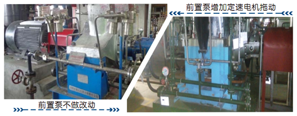 l 保留原有运行方式,前置泵不做改动。该方案改造后前置泵变速运行,工程施工量小,无需新增驱动电机,节能量较增加驱动电机的方案更大。