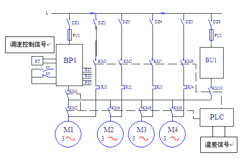 图中,BP1—伟德体育官方网站SB200-37T4变频器,BU—软启动器(自耦减压起动器),系统采用循环投切方式,温差信号送入PLC,经过PLC处理后,到变频器作为调速控制信号。整个系统的运行信息由PLC送到计算机上。