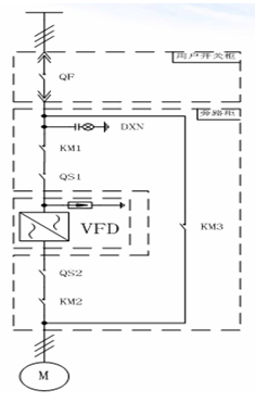 合KM3、分KM1、KM2、为工频模式。电机可由QF直接启停并进行保护,变频器可完全和电网脱离。