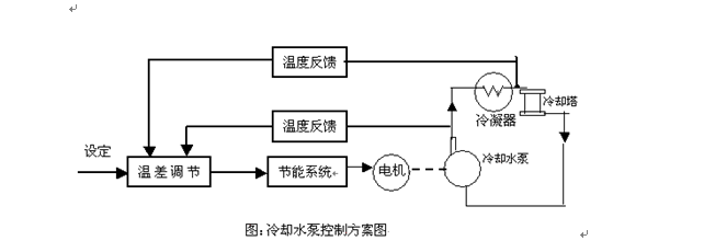 根据以上分析(以冷却泵进行分析说明):由于冷却塔的水温是随环境温度而变的,其单侧水温度不能准确地反映冷冻机组内产生热量的多少。所以,对于冷却泵,以进水和回水之间的温差作为控制依据,来实现进水和回水的恒温差控制。