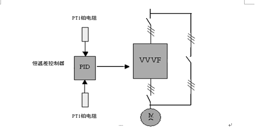 ●恒温差控制器,用于对Pt1和Pt2测得的温度信号进行转换、放大、求差,再进行PID恒温差运算处理后,得出0—10V模拟信号,输出,作为变频器的频率给定信号。如下图: