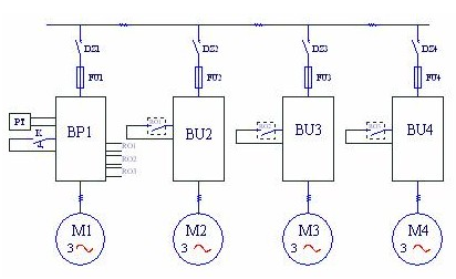 图中:BP1—变频器;BU2~BU4--软起动器,PT—压力变送器。由图一可见,变频器连接在第一台水泵电机上,需要加泵或减泵时,由变频器RO1~RO3端口输出信号起动或停止其他的水泵,这时水泵的起动采用自耦降压起动装置或软起动器。这种方案的特点是水泵电机不需要在变频和工频之间切换;第一台水泵永远连接在变频器上,没有切换过程中的失压现象;由于变频泵以外的泵都有软起动器,所以不需要再做备用系统,当变频器故障时,可用软起动器手动起动M2~M4水泵,保证供水不致中断;每台电机都有起动器,初始投资较大。另一种是“循环投切”方案,系统图如图二所示