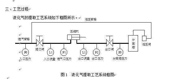 炼油产生的气体,经过压缩机加压后凝为液态进入分离塔,经过吸收等其他加工工艺,提取出石油液化气。进气口压力P1要求小于0.6MPa,压缩机出口压力P2可达到1.2MPa~1.7MPa之间,经出口阀调节后保证分离塔压力P3在1.05MPa。如果某种原因使分离塔压力升高,为安全起见则泄压阀打开,将分离塔内液体经管道回流进气口。
