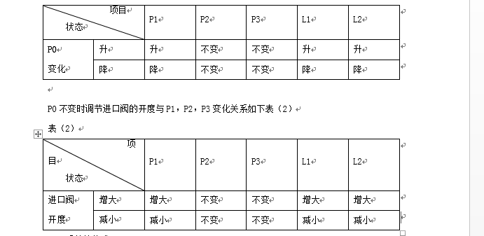 由表(1)和表(2)所反映的在P0改变时和进口阀开度改变时,P1、P2、P3和L1、L2的变化可见,进气P0的升高或降低,使P1、L1和L2发生相应的改变。如果要使流量L1和L2不变,可调节进口阀的开度往P0增加的相反方向变化,即P0增大,进口阀开度减少,或P0降低,进口阀开度增大。