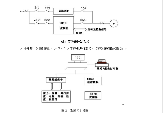 本系统数据采集卡采集压力、流量、阀门开度等模拟量,输出模拟量调节电动阀开度;采集报警和其他开关信号,输出备用系统起动信号、停止信号等。工控机通过RS485实现对变频器进行控制,P1压力通过数据采集卡采集,经工控机处理后,由RS485将控制信号送到变频器,控制变频器的频率的升降,达到恒定P1的目的,最终使流量基本不变。当然还要控制变频器的起停,同时电机的运行参数也要送工控机进行监控。工控机为一台CPU PⅢ、内存128M、硬盘20G的研祥工控机,配置数据采集卡、温度信号处理卡、开关信号接线板、RS485通讯卡、RS485通讯模块等。