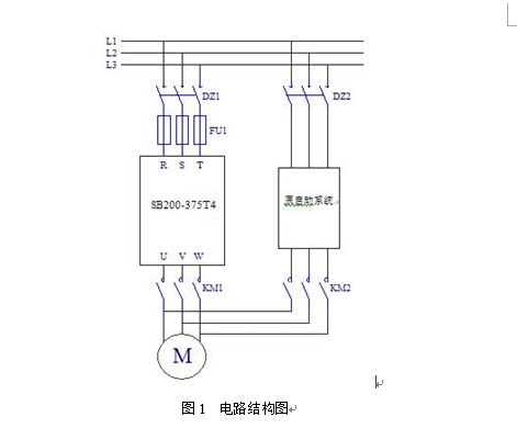 在原电机与开关之间增加一套变频装置,并保留了原有工频回路做旁路,其电路结构图如图1所示。