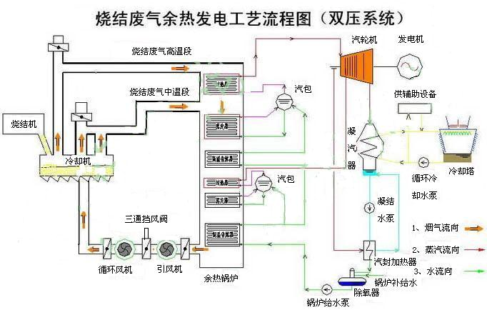 烧结余热回收主要有两部分:一是烧结机尾部废气余热,二是热烧结矿在冷却前空冷时产生的废气余热。这两部分废气所含热量约占烧结总耗能的50%,充分利用这部分热量是提高烧结能源利用效率,显著降低烧结工序能耗的途径之一。