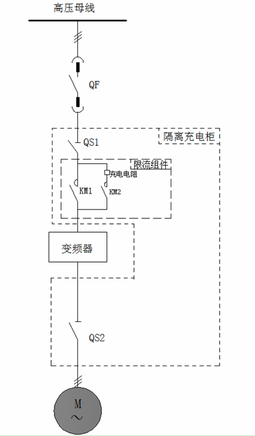 考虑到用户现场电网容量有限、电机功率较大。为了避免在送电瞬间的冲击电流,故在主回路中增加充电电阻。用来减小冲击电流及控制母线电压降。主回路采用真空接触器并实现在完成充电后自动投切。采用现场控制箱和DCS系统对高压变频器进行控制、监测。