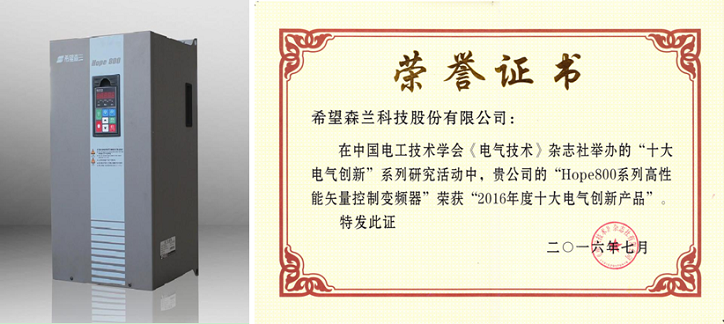 论坛召开期间,举行第七届十大电气创新产品、论坛年度创新产品展示活动。希望伟德体育官方网站Hope800系列高性能矢量控制变频器荣获“2016年度十大电气创新产品”。