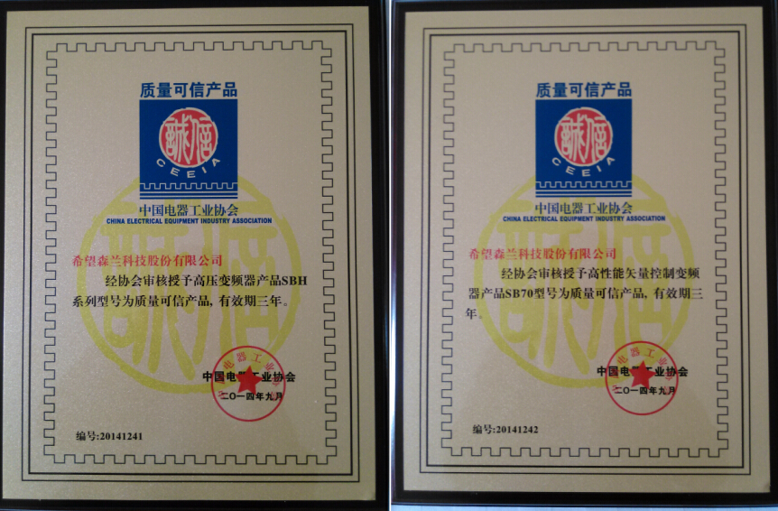 伟德体育官方网站SBH系列高压变频器、SB70高性能矢量控制变频器荣获中国电器工业协会“质量可信产品”奖